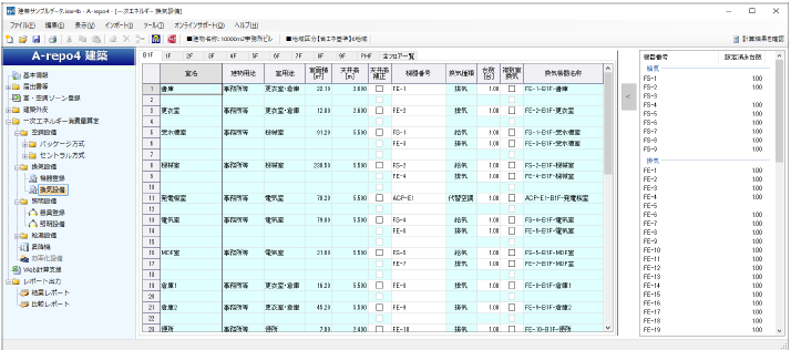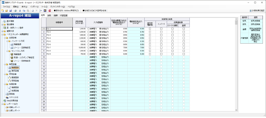 給気・排気・循環・代替空調用のファンを登録します。最大500行まで登録できます。