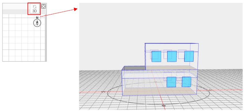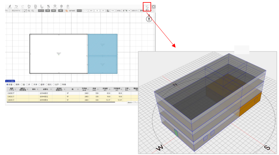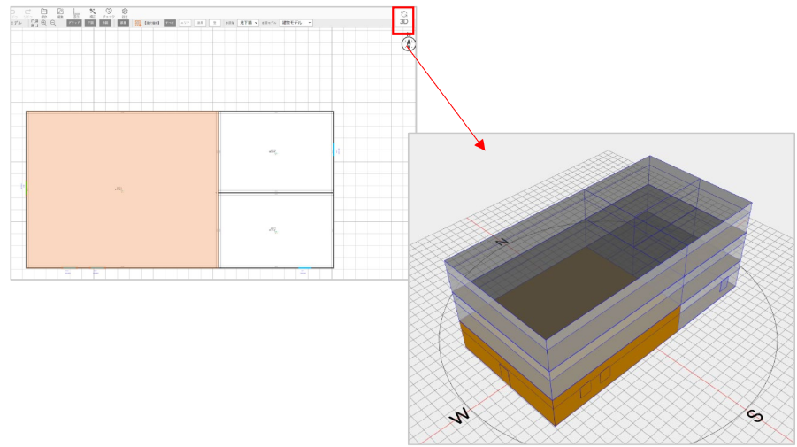 4 建物概要 ~ 16 屋根 で設定した建物情報を 3D で表示します。