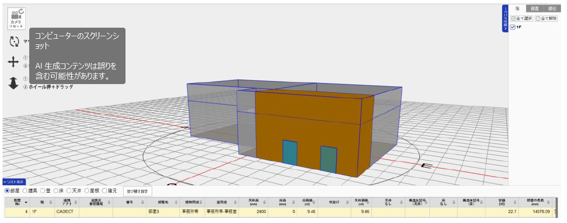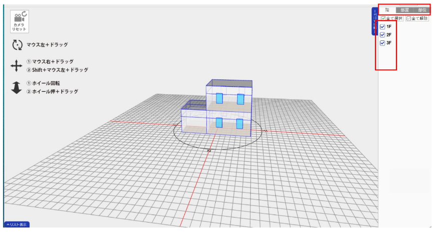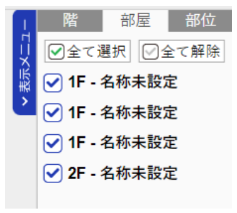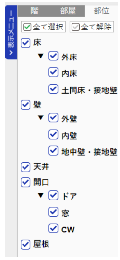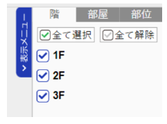 画面右の「表示メニュー」ボタンをクリックします。3D 表示しているものはチェックが入っています。「階」、「部屋」、「部位」タブの切り替えができ、単位ごとにチェックの有無で表示切り替えができます。