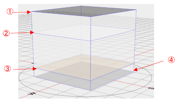 | ① | 階高上 | 灰色で表現します。部位の天井にチェックが入っている時に表示されます。 |