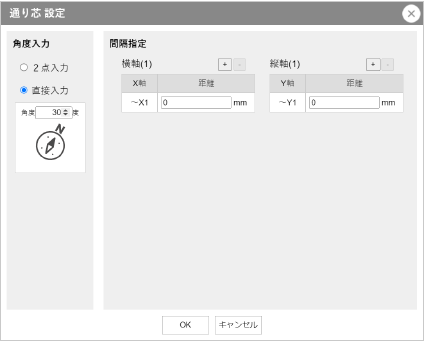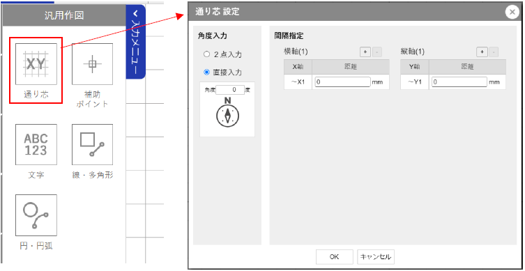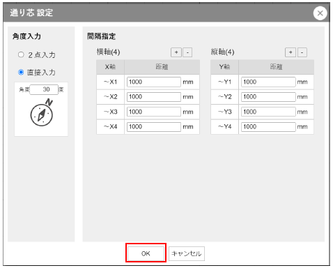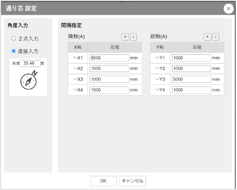 通り芯 設定ダイアログの角度入力で「2点入力」を選択し、角度を入力します。