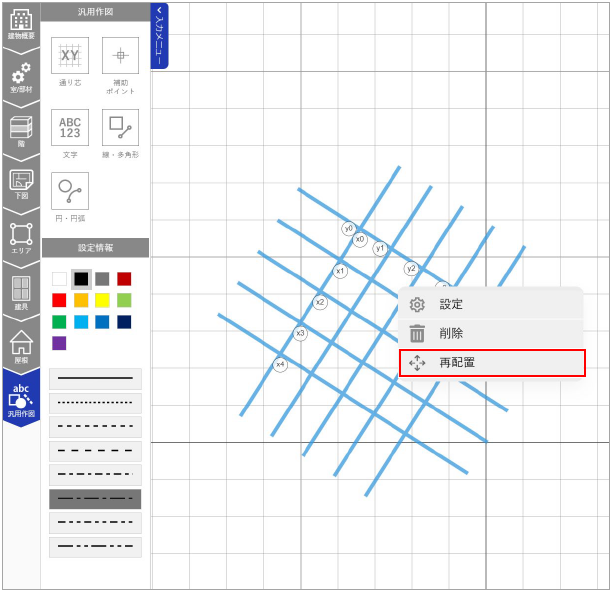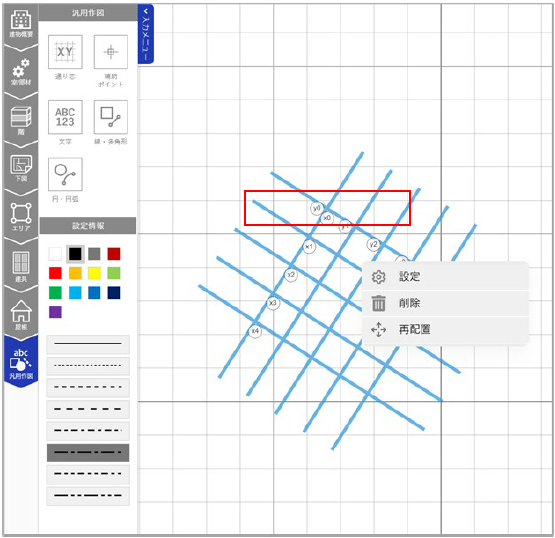 通り芯の軸(下記画像の場合のx0,1,2,3,4、y0,1,2,3,4)をクリックし、「再配置」ボタンをクリックします。