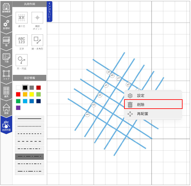 通り芯の軸(下記画像の場合のx0,1,2,3,4、y0,1,2,3,4)をクリックし、「削除」ボタンをクリックします。