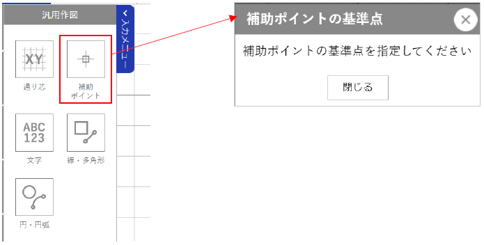 カテゴリメニューより、汎用作図を開き、「補助ポイント」ボタンをクリックし、基準原点設定ダイアログを開きます。