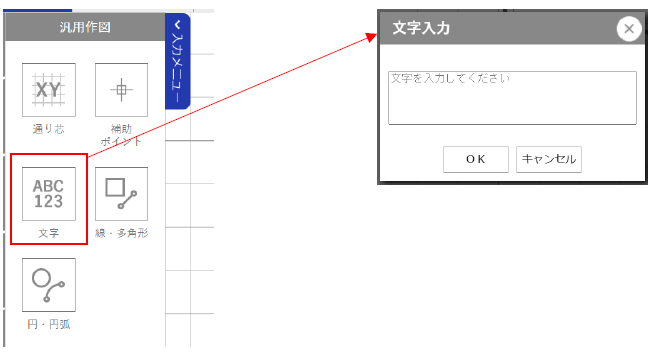 カテゴリメニューより、汎用作図を開き、「文字」ボタンをクリックし、文字入力ダイアログを開きます。