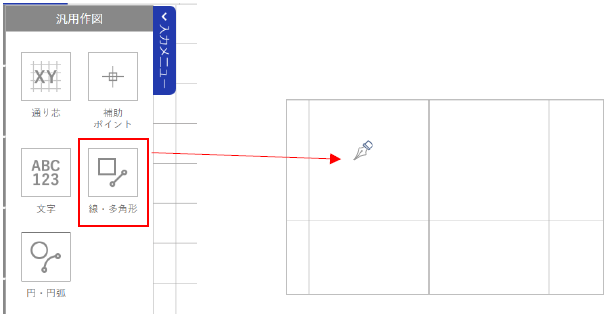 カテゴリメニューより、汎用作図を開き、「線・多角形」ボタンをクリックすると、マウスの矢印がペンに切り替わります。