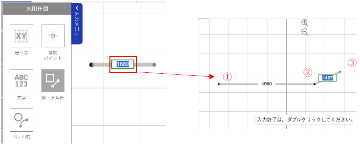 ③ (3点目)次の箇所をダブルクリックすると1点目から2点目までの線を描画します。