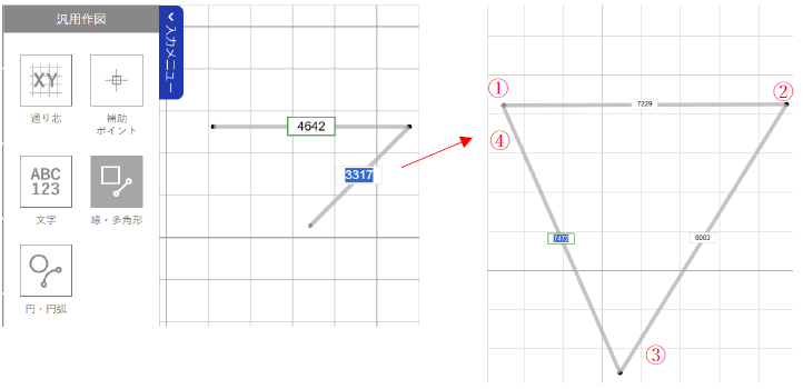 多角形を作成する場合は、線を引く場合の①②③の動作を行い、①始点と④終点が一致するところでクリック(もしくは、ダブルクリック)し描画します。