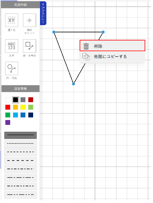「削除」ボタンをクリックし、線、多角形を削除します。Deleteキーからも削除できます。