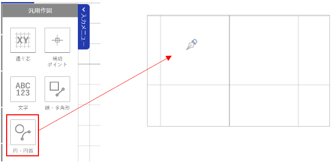 カテゴリメニューより、汎用作図を開き、「円・円弧」ボタンをクリックすると、マウスの矢印がペンに切り替わります。