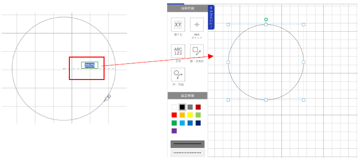 円を作成する場合は、編集領域内をクリック、もしくは、半径の上の数値表示をクリックし描きたい半径の長さを直接入力し円の大きさを決めます。