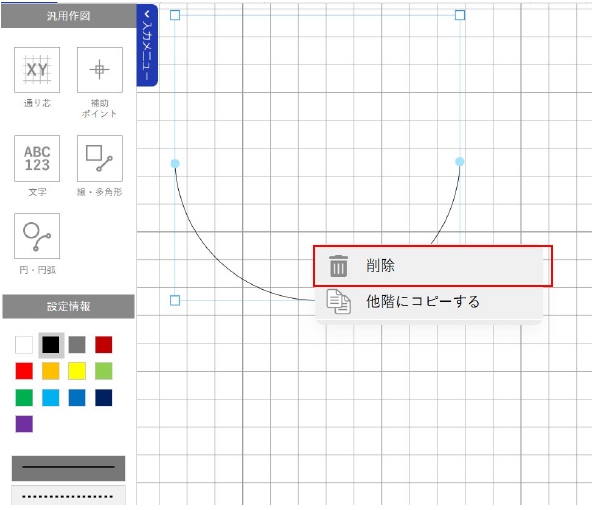 「削除」ボタンをクリックし、円・円弧を削除します。削除対象を選択後、Deleteキーからも削除できます。