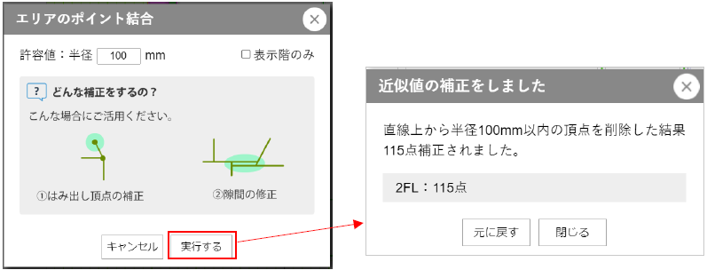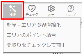 ヘッダーメニューの補正ボタンクリックし、「部屋・エリア境界直線化」ボタン、「エリアのポイント結合」ボタン、「間取りをチェックして補正」ボタンのいずれかをクリックして、ダイアログを表示します。