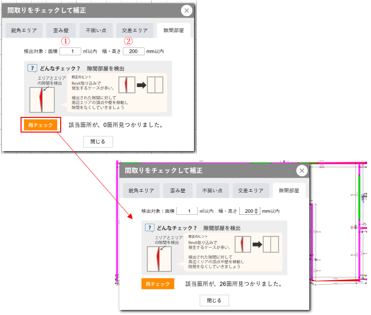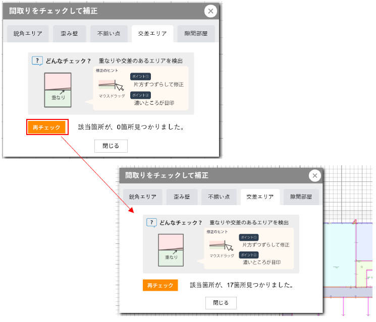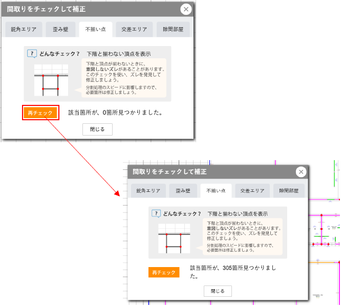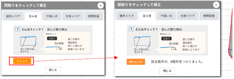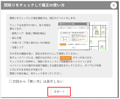 「間取りをチェックして補正」ボタンをクリックし、間取りをチェックして補正の使い方ダイアログを表示します。