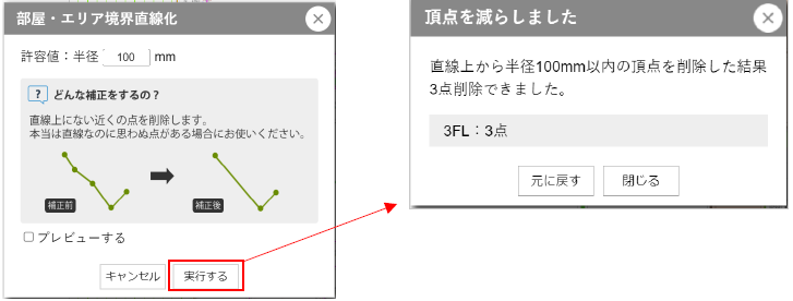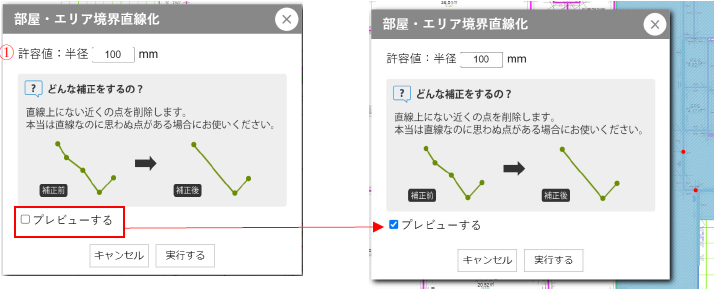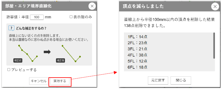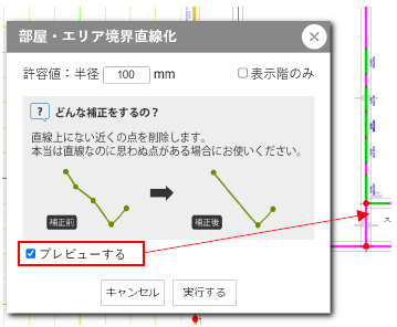「部屋・エリア境界直線化」ボタンをクリックし、部屋・エリア境界直線化ダイアログを表示します。