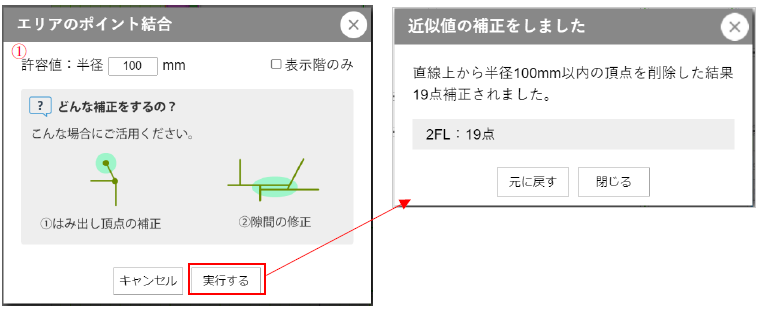 | ① | 許容値 | 頂点の部屋・エリア境界直線化を行うか否かの距離の閾値を示します。 少ないと部屋・エリア境界直線化で削除される頂点の数が減り、多いと削除される頂点の数が増えます。 |