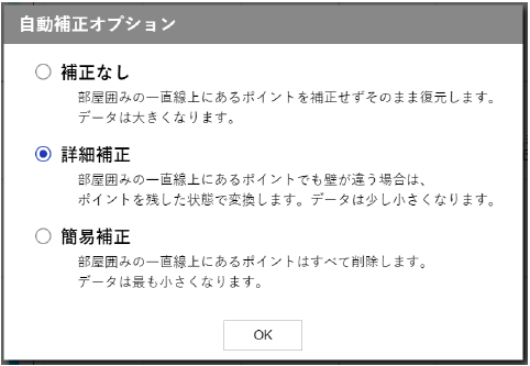 Revitデータ取込後、自動的に自動補正オプションのダイアログが表示されます。