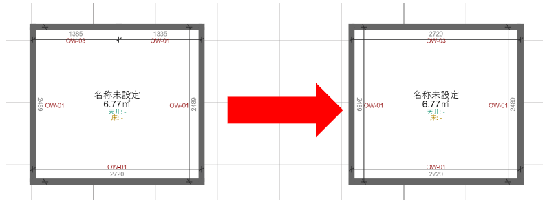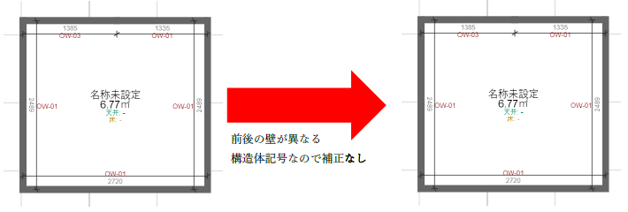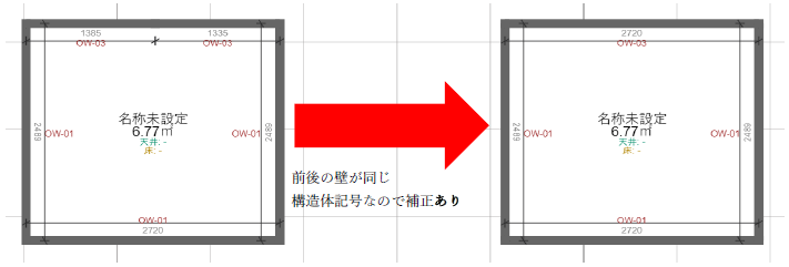 始点から終点まで順番に補正していくため、前後の壁の構造体記号が異なる場合には、前の壁の構造体記号が採用されます。