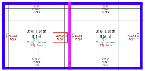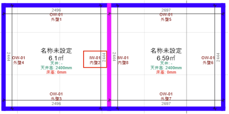 閉じるボタンで変更を適用すると、以下のように壁種別が内壁に変更されます。