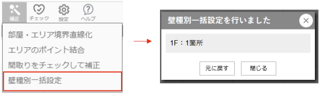 補正‐壁種別一括設定を実行すると、以下の完了メッセージが表示されます。