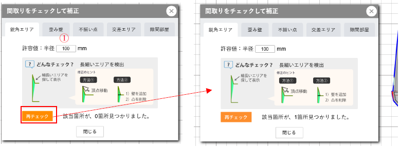 「チェック」ボタンをクリックし、歪んだ壁がある場合、壁を赤く表示します。