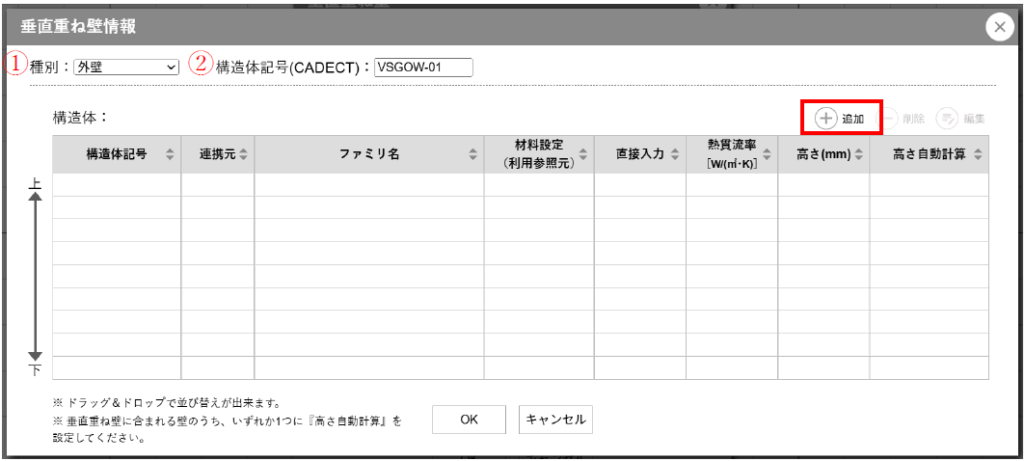 垂直重ね壁ダイアログの「追加」ボタンをクリックし、垂直重ね壁情報ダイアログを開きます。