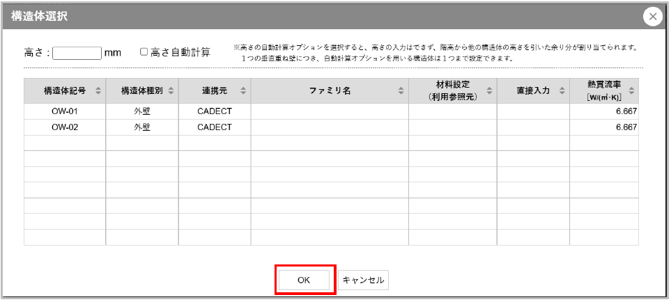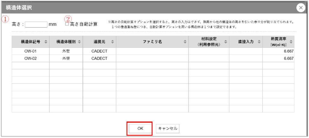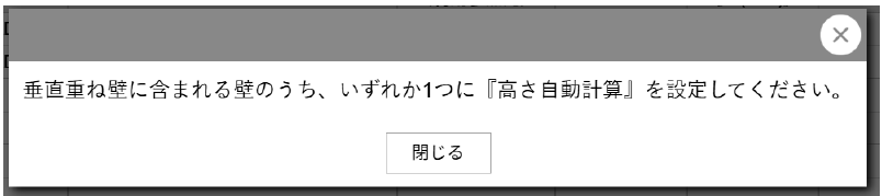 | ② | 高さ自動計算 | チェックを入れると、高さ自動計算オプションをオンにします。 高さの自動計算オプションをオンにした場合は高さの入力はできません。 階高から他の構造体の高さを引いた余り分を自動で割り当てします。 1つの垂直重ね壁につき、自動計算オプションに適用できる構造体は1つまでです。 また、垂直重ね壁に含まれる壁のうち、いずれか1つに「高さ自動計算」を設定してください。 設定していない場合は、下記のアラートを表示します。 ![]() |