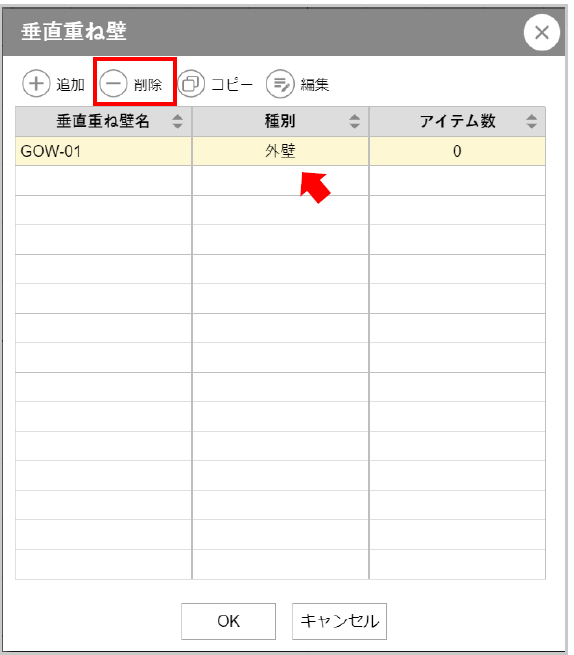 垂直重ね壁から削除したい構造体を選択し、「削除」ボタンをクリックします。