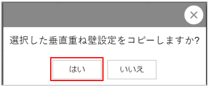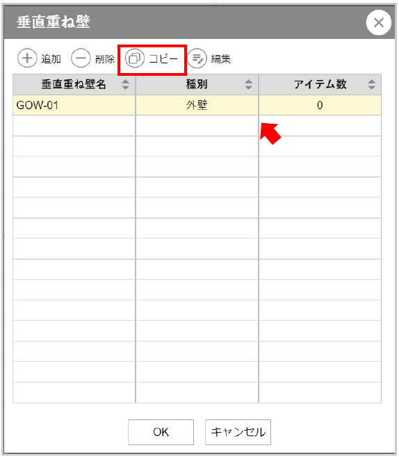 垂直重ね壁ダイアログのコピーしたい行を選択し、「コピー」ボタンをクリックします。