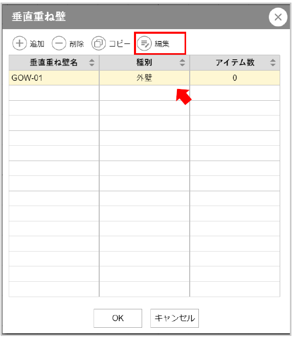 垂直重ね壁ダイアログの編集したい行を選択し、「編集」ボタンをクリックします。