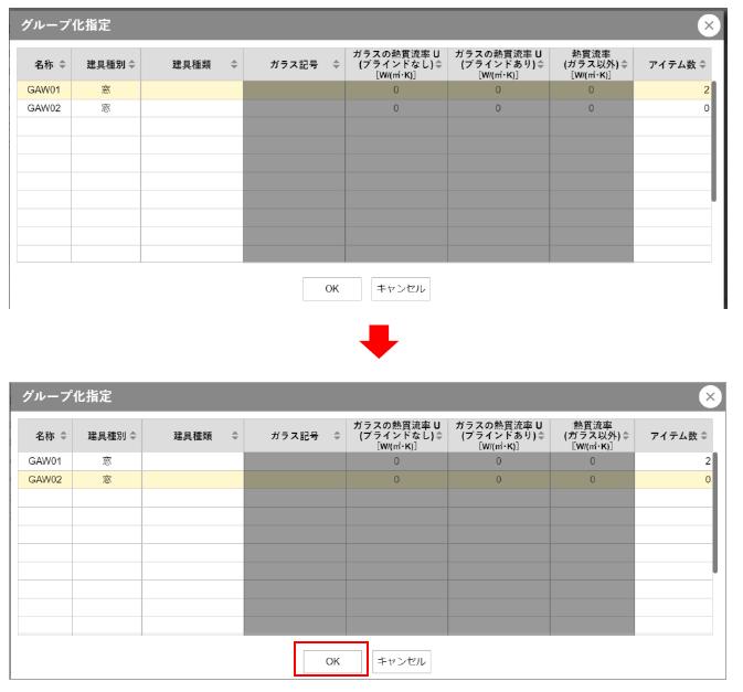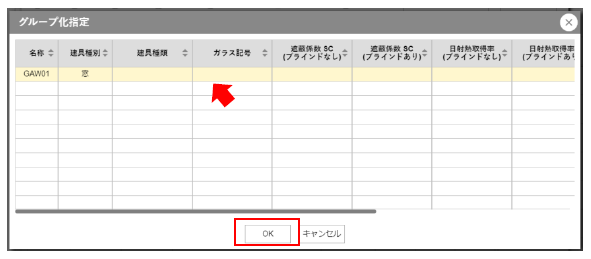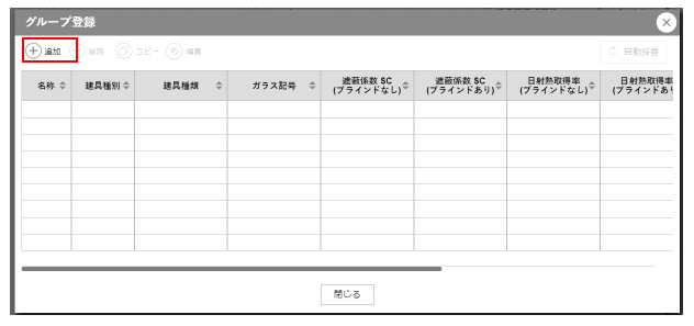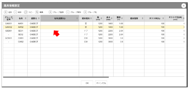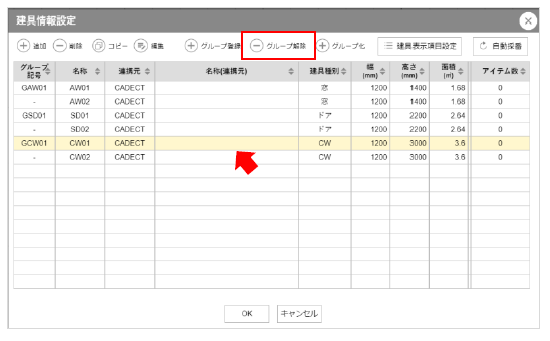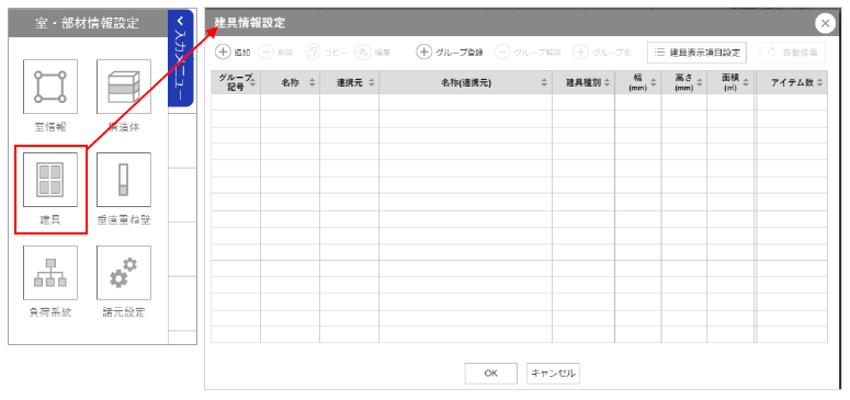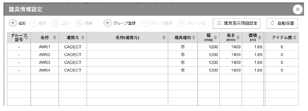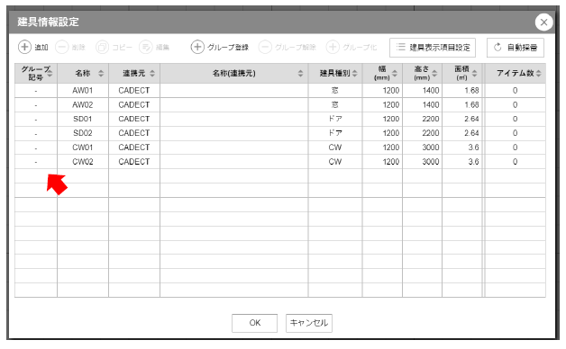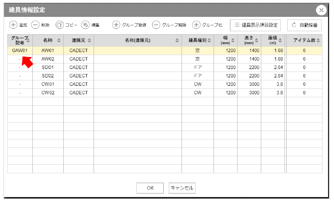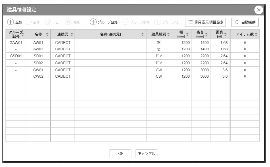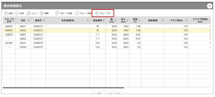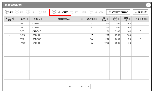建具情報設定の「グループ登録」ボタンをクリックして、グループ登録ダイアログを開きます。