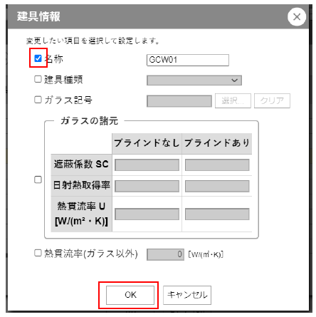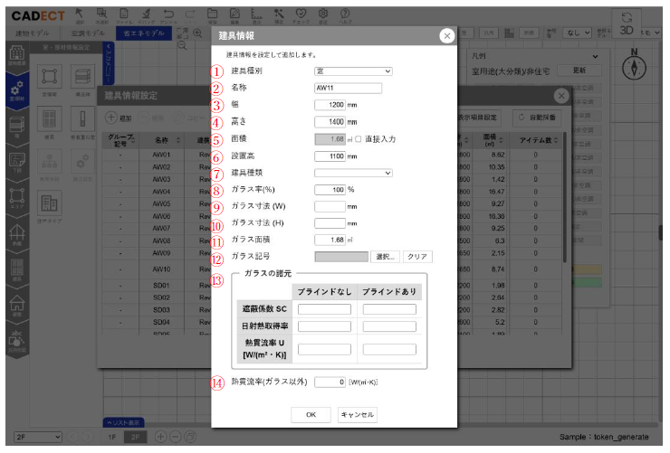 | ⑭ | 熱貫流率(ガラス以外) | 建具のガラス率を設定した部分以外の熱貫流率。 熱貫流率を数値入力します。 空調モデル、省エネモデルのみ入力可能です。 |