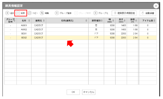 建具情報から削除したい建具の行を選択し、「削除」ボタンをクリックします。