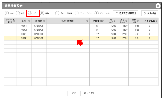 建具情報からコピーしたい建具の行を選択し、「コピー」ボタンをクリックします。