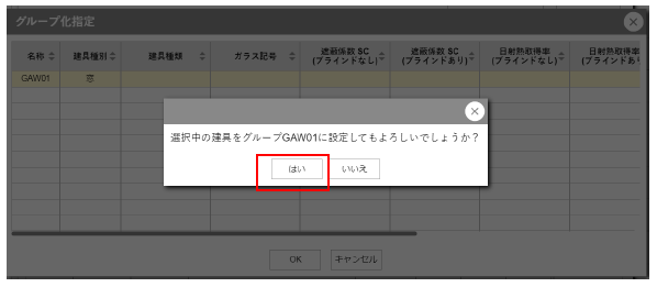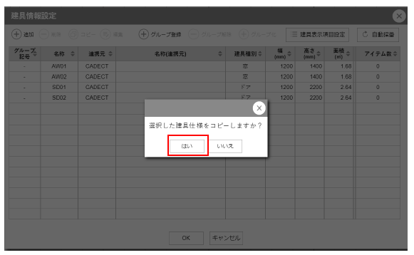 「はい」ボタンをクリックすると、テンプレートがコピーされ、建具情報設定リストの最後の行に追加されます。