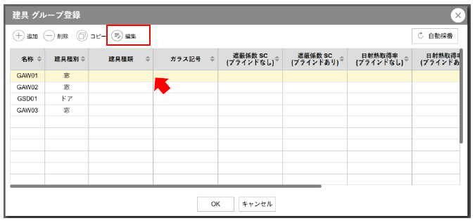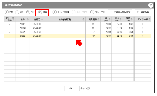 建具 グループ登録ダイアログを開き、編集したい行を選択し、「編集」ボタンをクリックします。