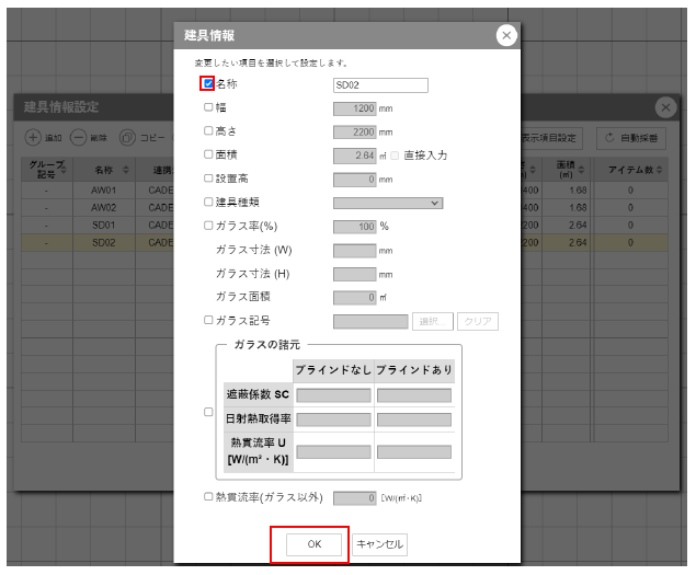 「建具」ボタンをクリックし建具情報設定ダイアログを開きます。