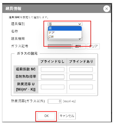 設定したい建具種別(窓・ドア・CW)を選択入力し、OKをクリックします。