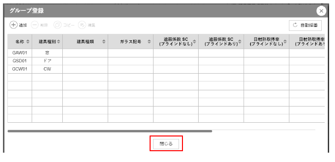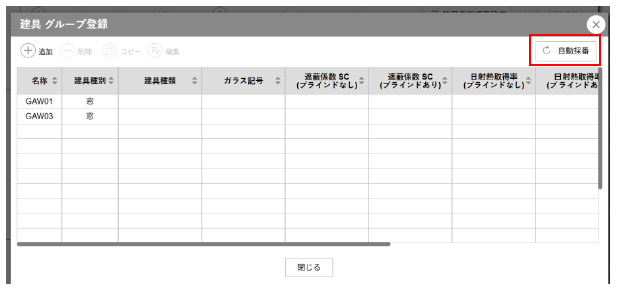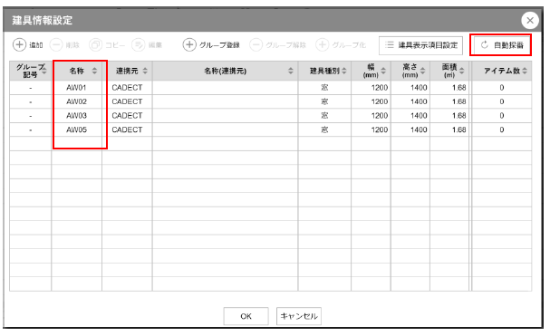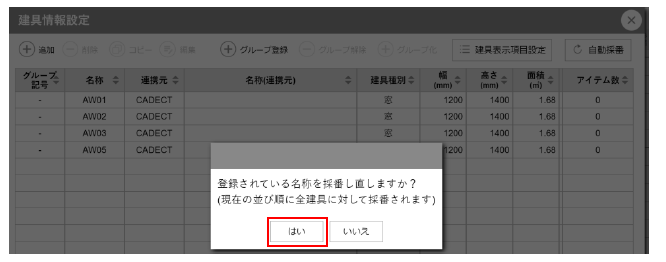 グループ建具名称を連番に採番しなおしたい場合は、「自動採番」ボタンをクリックします。