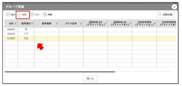 建具 グループ登録ダイアログを開き、削除したい行を選択し、「削除」ボタンをクリックします。