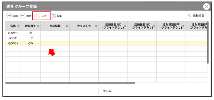 建具グループ登録ダイアログを開き、コピーしたい行を選択し、「コピー」ボタンをクリックします。
