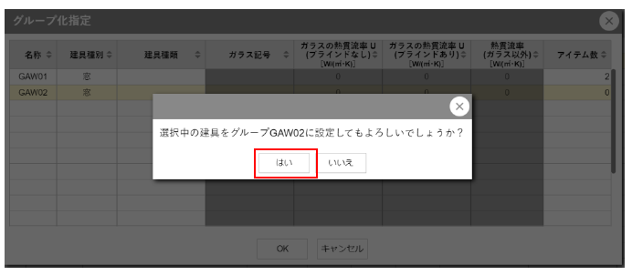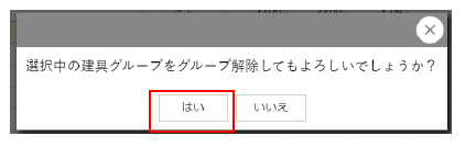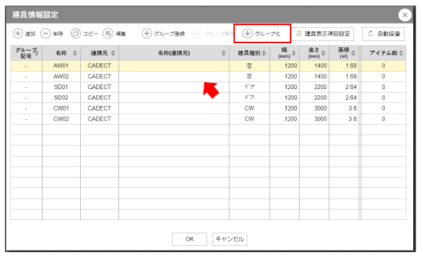 グループ化したい建具を選択し、「グループ化」ボタンをクリックします。