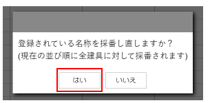 グループ登録時の建具名称を複数登録した後、一部削除するなど名称の連番に欠番が発生した際、名称を連番に採番しなおす機能です。