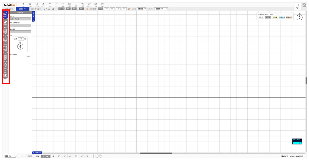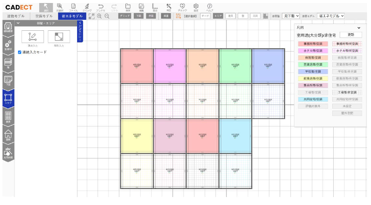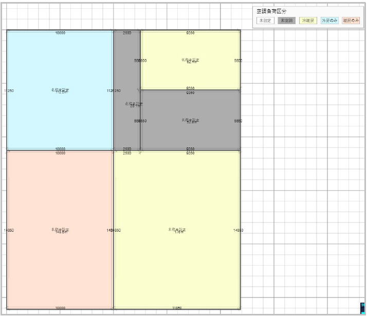 | ② | 空調モデル | 空調負荷区分が確認できます。 エリアごとに非空調(換気あり)、非空調(換気無し)、冷暖房、冷房のみ、暖房のみを色で分けて確認できます。 ![]() |