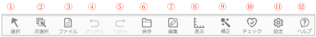| ⑦ | 編集 | エリア情報の編集に関する機能です。 【編集情報】 ・アンドゥ…手順の一つ前に戻ります。 ・リドゥ…手順の次に進みます。アンドゥ使用時に使います。 |