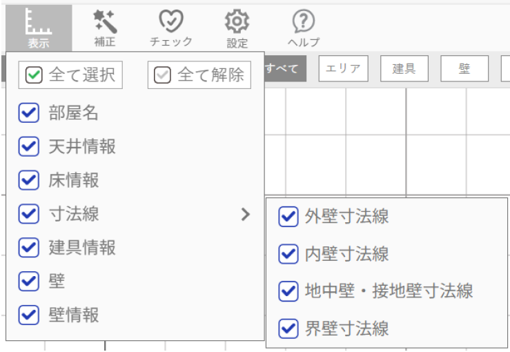 | ⑧ | 表示 | 部屋名、天井情報、床情報、寸法線(外壁寸法線、内壁寸法線、地中壁・接地壁寸法線、界壁寸法線)、建具情報、壁、壁情報、の表示/非表示。 「全て選択」、「全て解除」ボタンをクリックすると、表示/非表示を一括操作できます。 |