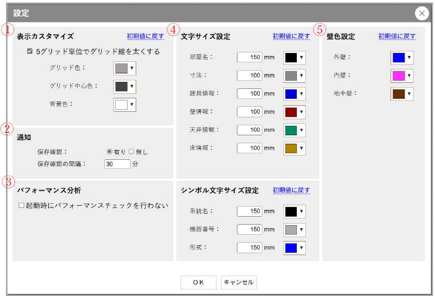 | ⑪ | 設定 | 表示カスタマイズ、パフォーマンス分析、文字サイズ、壁色を設定します。 各種設定情報を入力し、「OK」ボタンをクリックします。 |