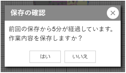 | ② | 通知 | 自動保存確認ダイアログの設定をします。 保存確認「有り」を選択した場合、保存確認の間隔の時間に応じて保存確認ダイアログを自動通知します。 デフォルトは、「有り」に設定されています。 「無し」を選択した場合は通知しません。 保存確認の間隔:5分~300分の間で設定できます。 ![]() 保存の確認の際「はい」を選択した場合は、「保存ダイアログ」へ遷移します。 保存の詳細については、『保存』をご参照ください。 |
