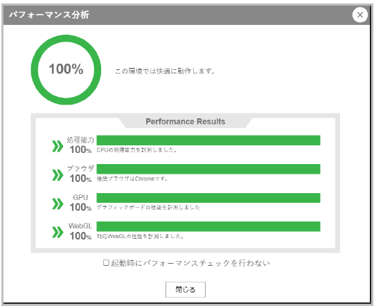 | ③ | パフォーマンス分析 | 起動時にパフォーマンス分析ダイアログを表示するかどうかを設定します。 起動時に表示させない場合は、「起動時にパフォーマンスチェックを行わない」へチェックを入れます。 パフォーマンス分析の詳細については、『1.1』をご参照ください。 ![]() |