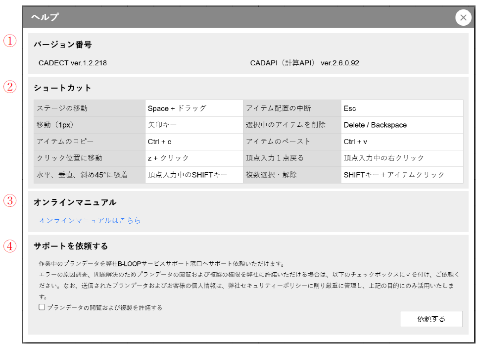 | ⑫ | ヘルプ | CADECTのバージョン番号、ショートカットキー一覧、オンラインマニュアル、プランデータの送信(サポート専用)に関する記載があります。 |